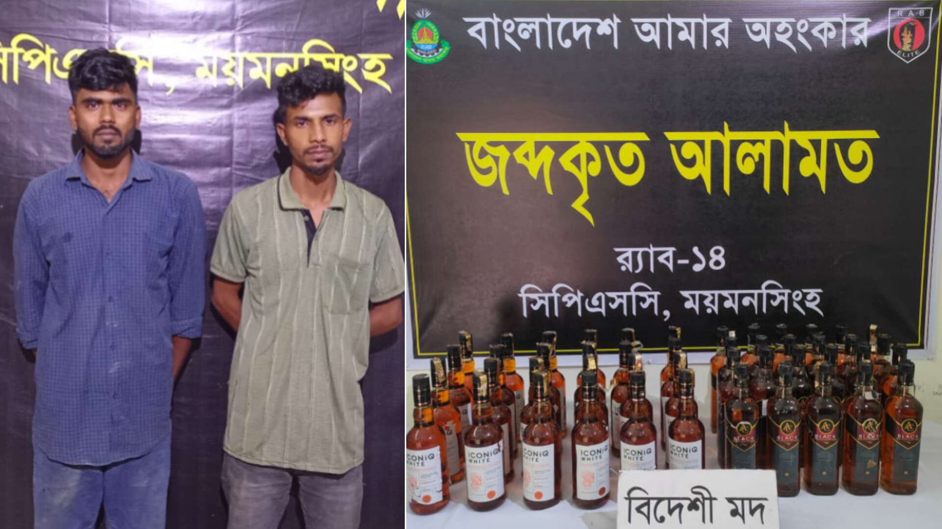 ময়মনসিংহের ধোবাউড়ায় র্যাব-১৪ এর সিপিএসসি, ময়মনসিংহ কোম্পানির একটি বিশেষ অভিযানে বিপুল পরিমাণ বিদেশি মদসহ দুই যুবককে গ্রেফতার করা হয়েছে। অভিযানে উদ্ধার হওয়া ৪৭ বোতল বিদেশি মদের বাজারমূল্য প্রায় ৪ লক্ষ ৭০ হাজার টাকা বলে জানিয়েছে র্যাব।