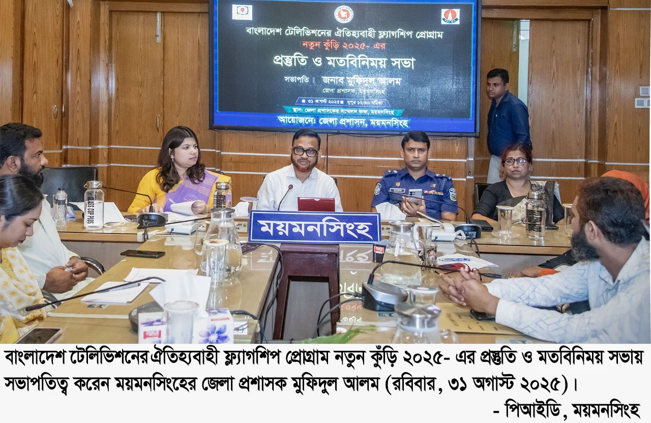 ময়মনসিংহ বাংলাদেশ টেলিভিশনের জনপ্রিয় শিশু-কিশোর প্রতিযোগিতা ‘নতুন কুঁড়ি ২০২৫’–কে ঘিরে ময়মনসিংহে অনুষ্ঠিত প্রস্তুতি ও মতবিনিময় সভায় আয়োজনে সর্বাত্মক সফলতা নিশ্চিত করার প্রত্যয় ব্যক্ত করেছেন সংশ্লিষ্টরা। রবিবার বিকেলে জেলা প্রশাসক মুফিদুল আলমের সভাপতিত্বে নিজ সভাকক্ষে এ সভা অনুষ্ঠিত হয়।