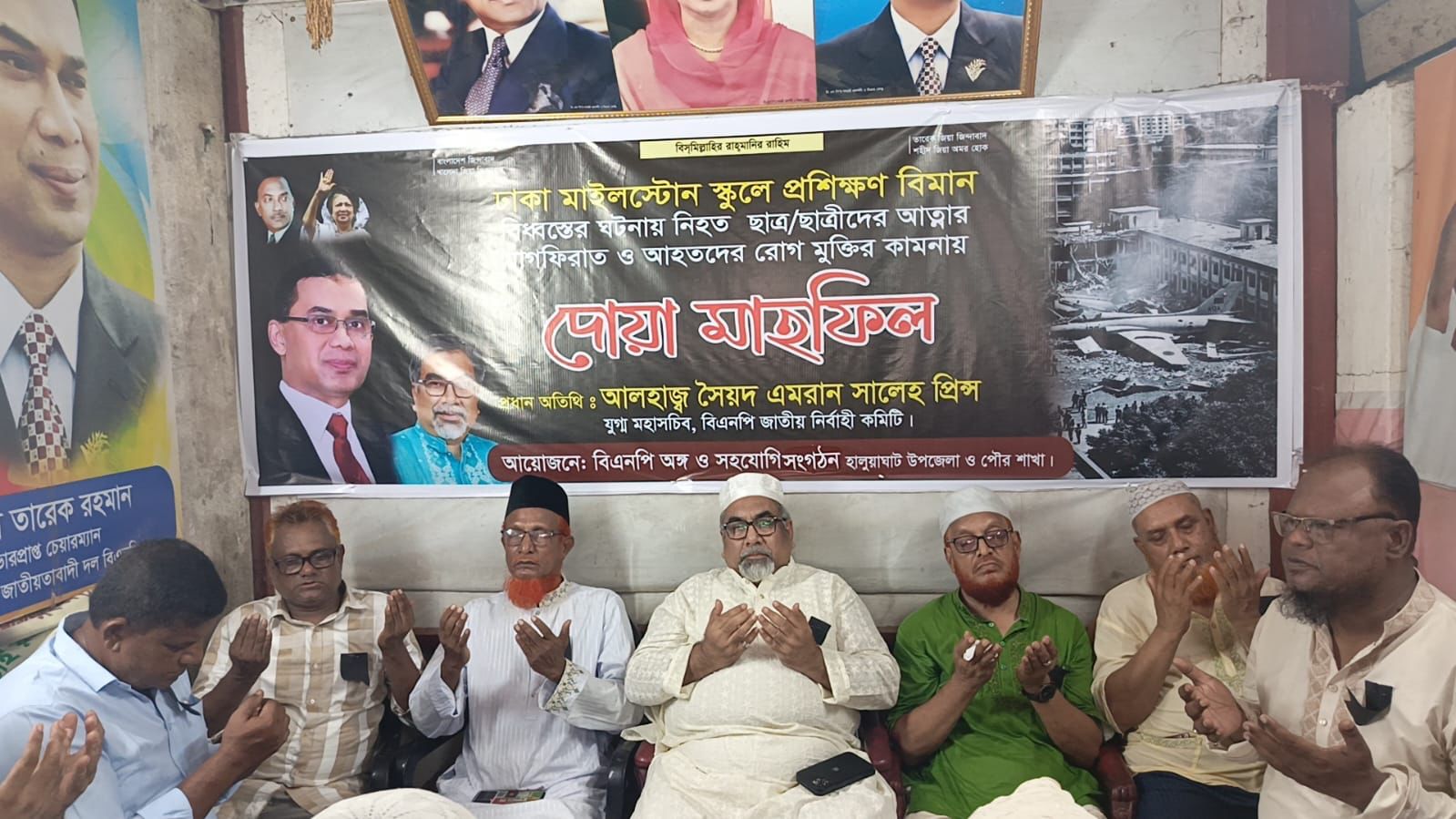 দোয়া মাহফিলে বিএনপির যুগ্ম মহাসচিব সৈয়দ এমরান সালেহ প্রিন্স বিমান দুর্ঘটনায় নিহতদের প্রতি গভীর শোক প্রকাশ করে বলেন, স্কুলে পাঠরত অবস্থায় কোমলমতি শিক্ষার্থীদের এই মর্মান্তিক মৃত্যু আমাদের জাতিগত শোক ও বেদনায় পরিণত হয়েছে। বাংলাদেশ আজ তার ভবিষ্যৎ সম্ভাবনার সূর্য সন্তানদের হারিয়েছে