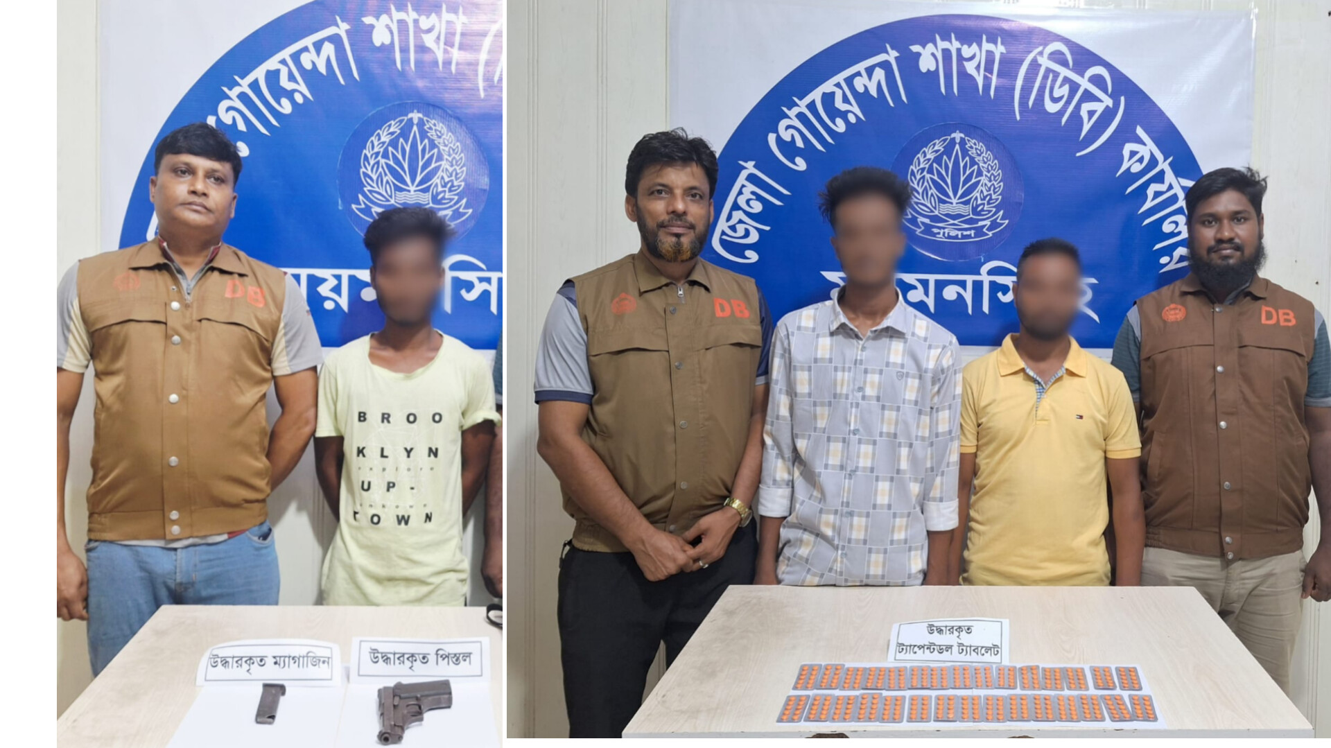 ময়মনসিংহ জেলা গোয়েন্দা (ডিবি) পুলিশের পৃথক অভিযানে অবৈধ বিদেশি পিস্তল, ম্যাগাজিন ও ৩০০ পিস ট্যাপেন্টাডল ট্যাবলেটসহ তিনজনকে গ্রেফতার করা হয়েছে। গ্রেফতার ব্যক্তিদের মধ্যে একজন অস্ত্র কারবারের সঙ্গে জড়িত থাকলেও অপর দুজন দীর্ঘদিন ধরে মাদক ব্যবসা চালিয়ে আসছিল বলে জানিয়েছে পুলিশ।