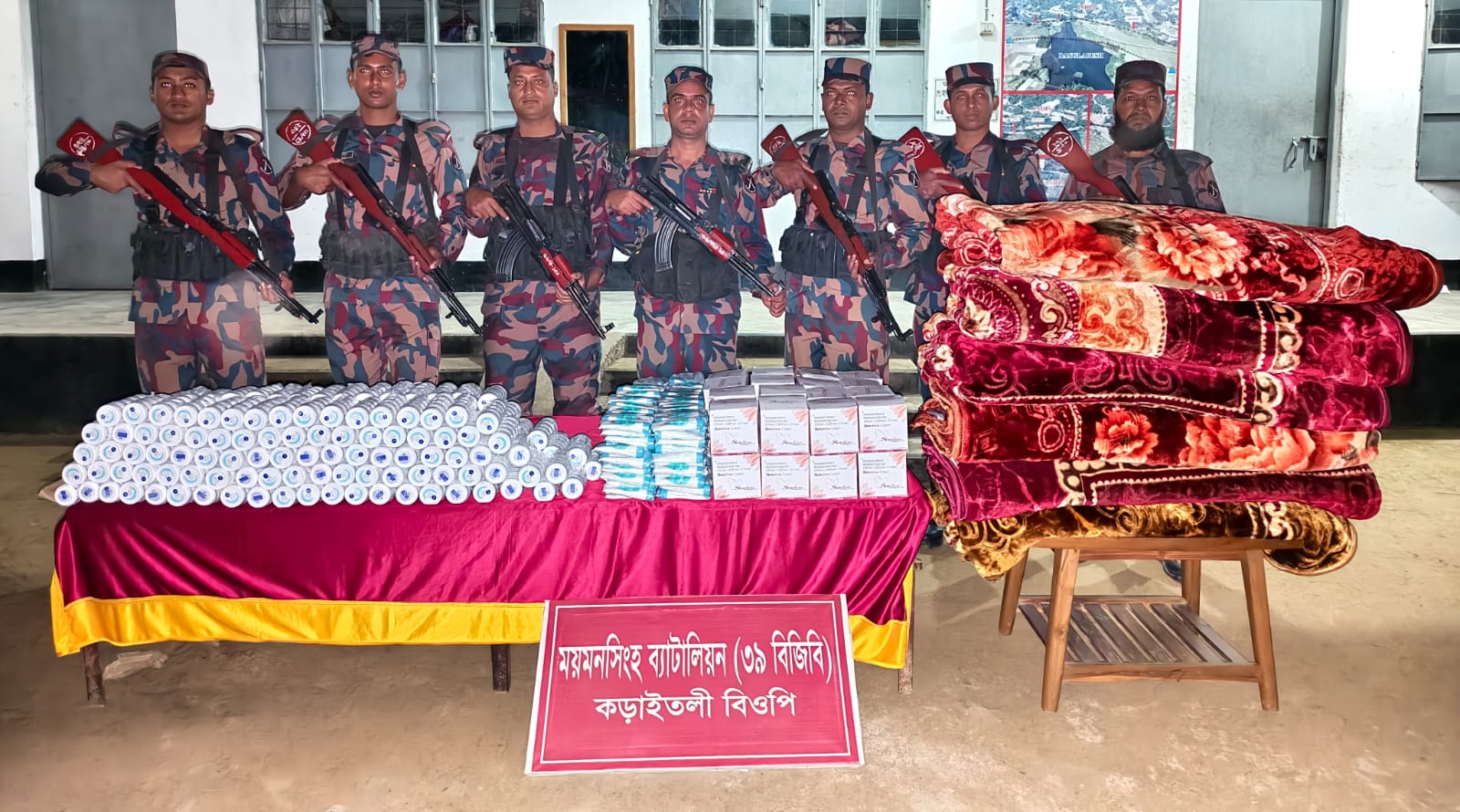 ময়মনসিংহ–শেরপুর সীমান্তে বিজিবির অভিযানে বিপুল পরিমাণ ভারতীয় মালামাল জব্দ