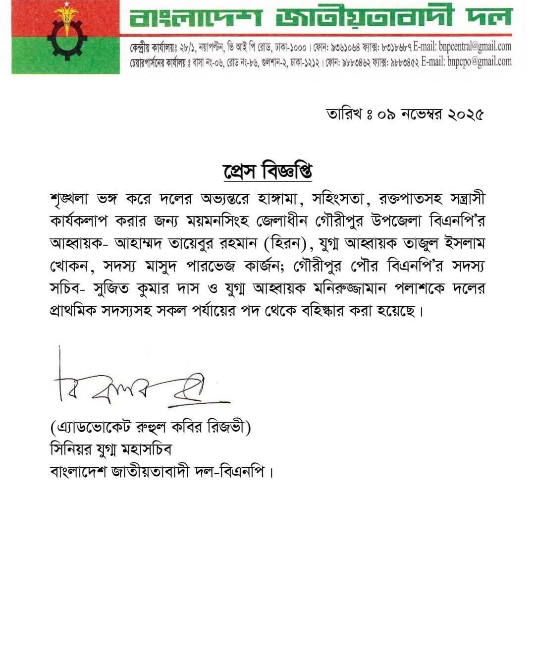 রবিবার বাংলাদেশ জাতীয়তাবাদী দলের সিনিয়র যুগ্ম মহাসচিব এ্যাডভোকেট রুহুল কবির রিজভী স্বাক্ষরিত এক বিজ্ঞপ্তিতে জানানো হয়, গৌরীপুর উপজেলা ও পৌর বিএনপির আহ্বায়ক-আহ্বায়কসহ কয়েকজন নেতাকে প্রাথমিক সদস্যসহ সকল পর্যায়ের পদ থেকে বহিষ্কার করা হয়েছে।