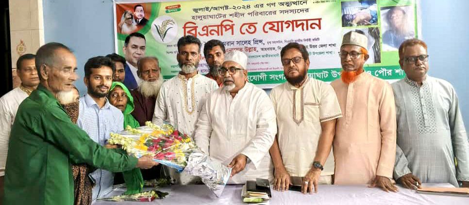 রবিবার দুপুরে হালুয়াঘাট পৌর শহরের ইমেক্স হোটেলে উপজেলা ও পৌর বিএনপির উদ্যোগে এক যোগদান অনুষ্ঠানের আয়োজন করা হয়। অনুষ্ঠানে ৫ আগস্ট গাজীপুরের মাওনায় পুলিশের গুলিতে নিহত কাওসার বিজয় ফরাজীর পিতা সায়েদুল ইসলাম ফরাজী, ১৯ জুলাই ঢাকার মিরপুর ১০ নম্বরে হেলিকপ্টার থেকে গুলি বর্ষণে নিহত শেখ সেলিমের পিতা কলিম উদ্দিন, মা সখিনা খাতুন, স্ত্রী আসমা খানম, ছেলে শাওন এবং ২০ জুলাই গাজীপুরে পুলিশের গুলিতে নিহত মনির হোসেন রাসেলের পিতা নিজাম উদ্দিন বিএনপির প্রাথমিক সদস্য ফরমে স্বাক্ষর করে আনুষ্ঠানিকভাবে বিএনপিতে যোগদান করেন। নিহত মনির হোসেন রাসেলের লাশ এখনও পাওয়া যায়নি বলে পরিবার জানায়।