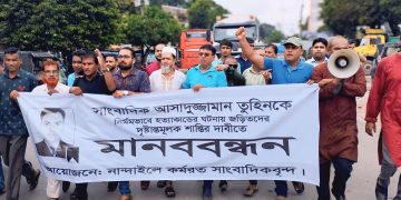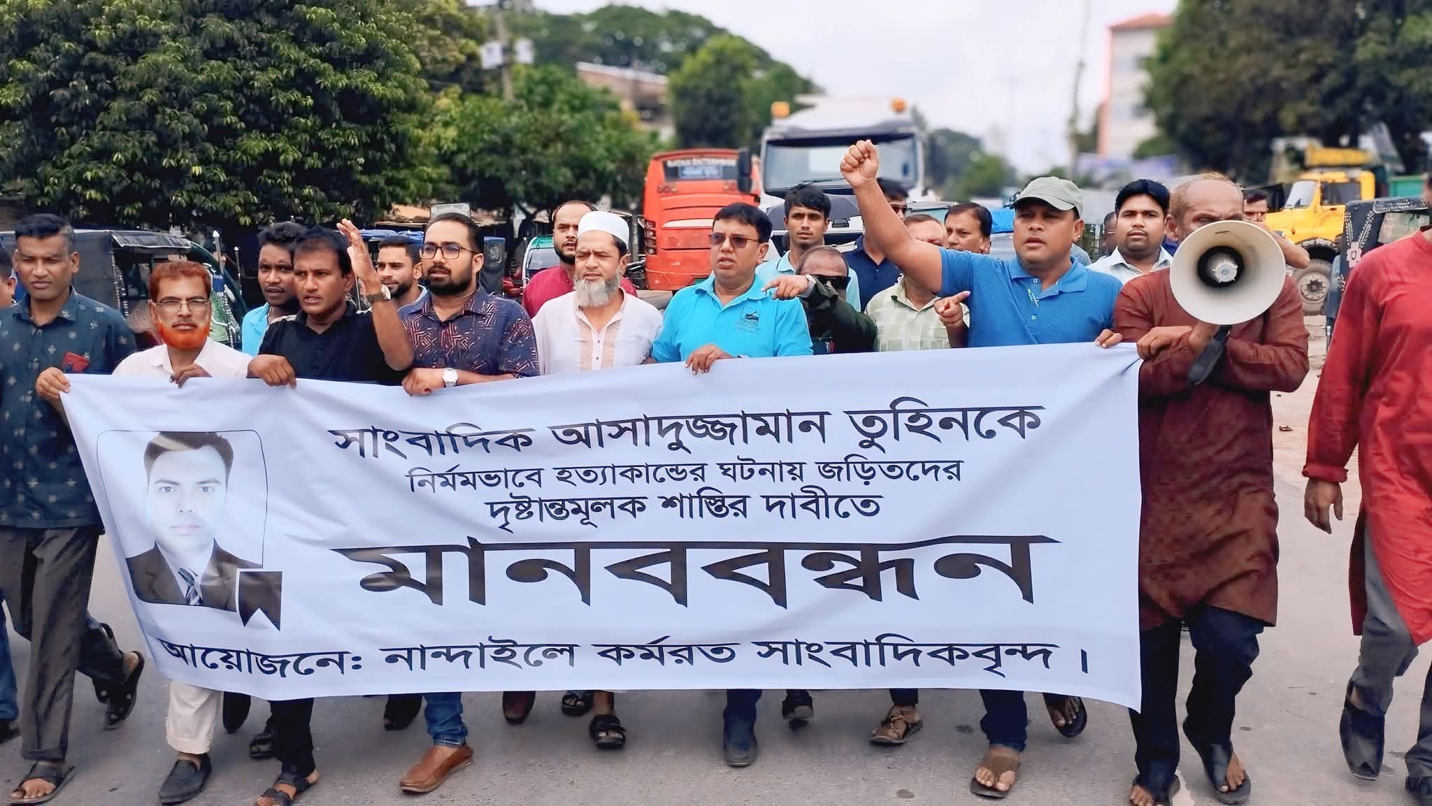 নান্দাইলে সাংবাদিক তুহিন হত্যার প্রতিবাদে মানববন্ধ