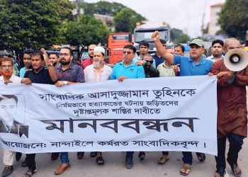 নান্দাইলে সাংবাদিক তুহিন হত্যার প্রতিবাদে মানববন্ধ নান্দাইল (ময়মনসিংহ) প্রতিনিধিঃ গাজীপুরের সাংবাদিক আসাদুজ্জামান তুহিনকে নৃশংসভাবে হত্যার প্রতিবাদে ও গ্রেফতারকারীদের দ্রুত দৃষ্টান্তমূলক শাস্তির দাবিতে নান্দাইলে কর্মরত সাংবাদিকরা মানববন্ধন ও প্রতিবাদ সভা করেছে। ...